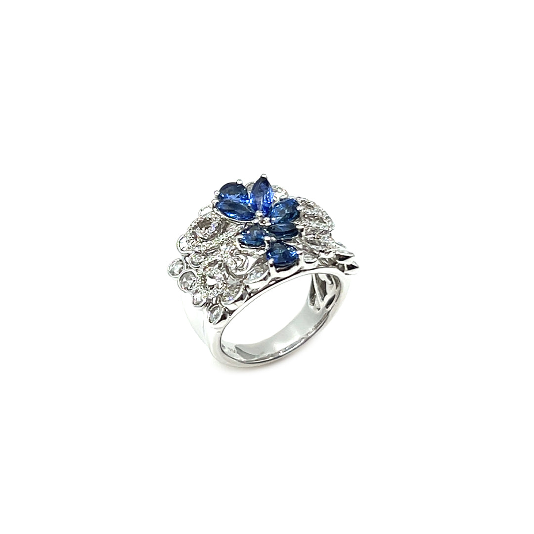 This stunning 18kt. white gold one of a kind hand crafted design features a combination of natural blue pear and marquise shape ceylon sapphire, approximately 2.41ctw. accented with an array of round brilliant cut  and rose cut natural diamonds surrounding the  design. The diamonds are approximately 2.00ctw., within the range of VS1 clarity G color. This ring is crafted in a size 6.50, but may be resized to any ring size by contacting us prior to placing your order. The approximate width of this ring shank measures 10.65mm. on the top shoulder area and tapers down to  4.33mm. towards the back of the shank. Please confirm your ring size based on the width of this design, as wider rings will fit more snug in the same ring size than slimmer ring designs.