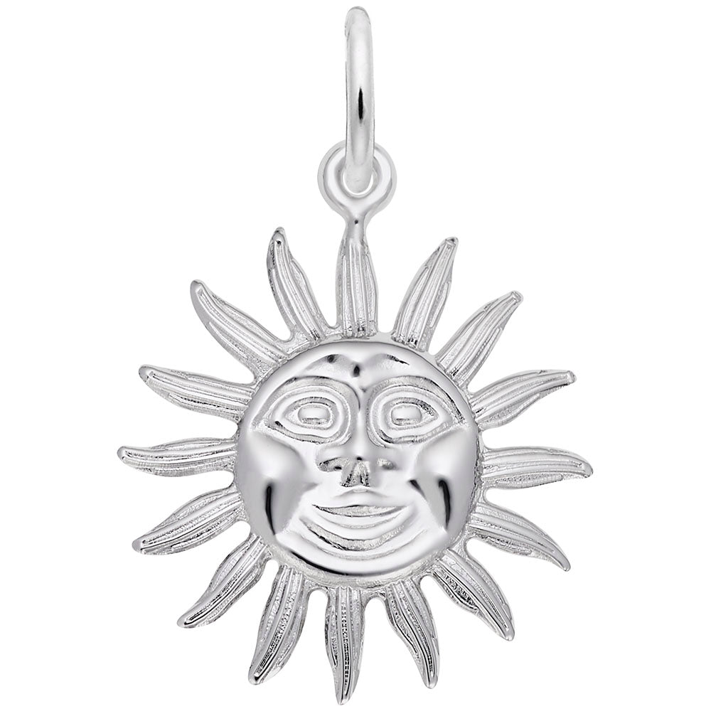 The Sunshine Charm is a joyful expression of warmth, power, and hope. Masterfully crafted in your choice of 10K yellow gold or rhodium plated sterling silver or gold plated sterling silver, this design features a radiant sun face accented with textured rays, capturing the brilliance and energy of the sun.