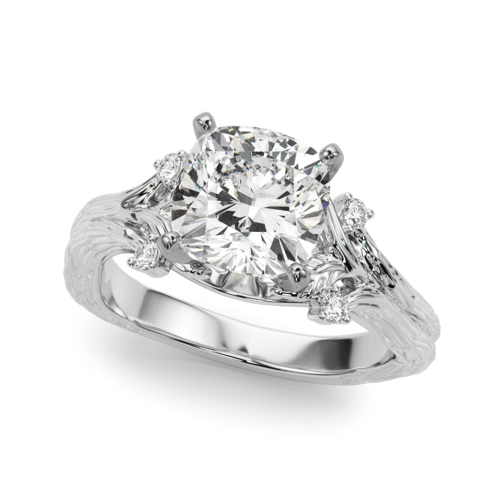 This distinct engagement ring is crafted in your choice of 14k white, yellow, or rose gold, featuring a striking nature-inspired aesthetic. It showcases a beautiful 1.00ct Cushion Cut Diamond, known for its romantic, pillow-like shape and exceptional fire. The bold band is carved with a deep, realistic bark texture, giving the piece a rustic yet luxurious feel. Nestled subtly within the textured metal are a few round accent diamonds, which provide a quiet sparkle and total approximately 0.06ctw, emphasizing the organic artistry of the design.