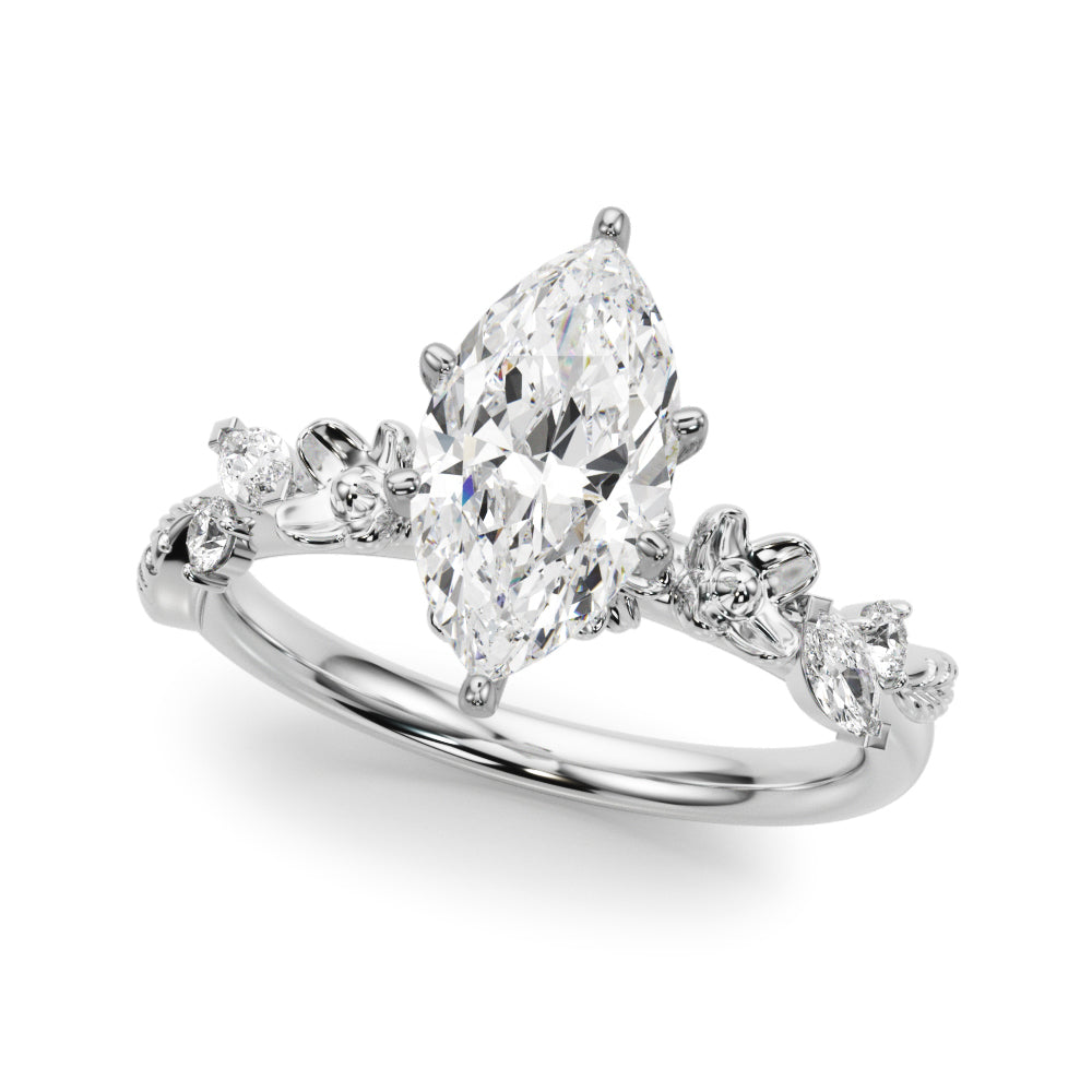 This enchanting engagement ring is crafted in your choice of 14k white, yellow, or rose gold, featuring a highly romantic, floral-inspired design. It showcases an elegant 1.00ct Marquise Cut Diamond, known for its elongated shape and pointed ends, which creates a flattering look on the finger. The setting appears to bloom from the band. The shank is delicately adorned with sculpted metal petals and shimmering marquise and round accent diamonds, giving the impression of flowers and leaves climbing toward the center stone. These nature-inspired melee diamonds total approximately 0.20ctw, providing a subtle yet highly detailed sparkle along the band.