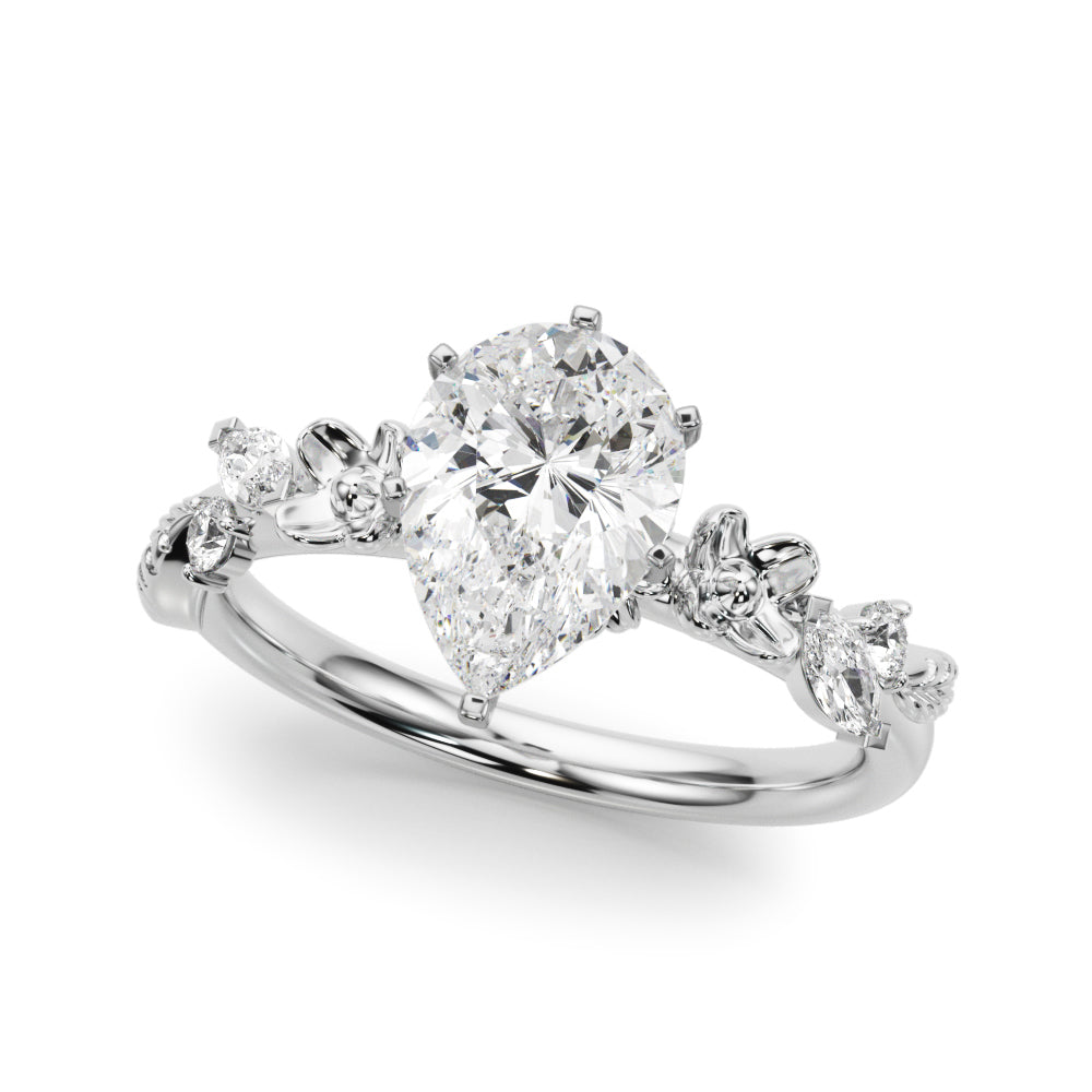 This enchanting engagement ring is crafted in your choice of 14k white, yellow, or rose gold, featuring a highly romantic, floral-inspired design. It showcases an elegant 1.00ct Pear Cut Diamond, known for its beautiful teardrop shape, which combines the brilliance of a round cut with a flattering, elongated silhouette. The setting appears to bloom from the band. The shank is delicately adorned with sculpted metal petals and shimmering marquise and round accent diamonds, giving the impression of flowers and leaves climbing toward the center stone. These nature-inspired melee diamonds total approximately 0.20ctw, providing a subtle yet highly detailed sparkle along the band.