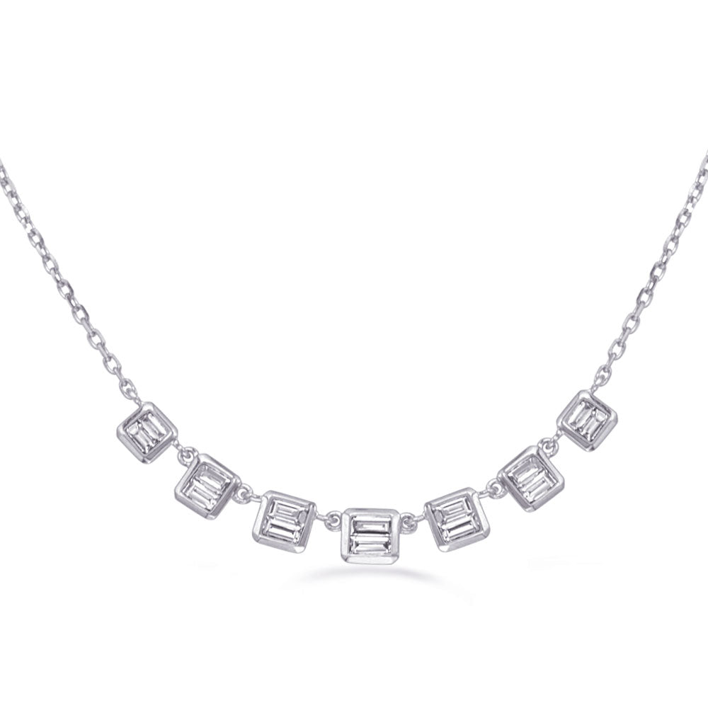 This necklace is available in 14K White and Yellow Gold. There are a total of 14 stones. There are baguette diamonds with a total carat weight of 0.42ct set in a Channel Set setting