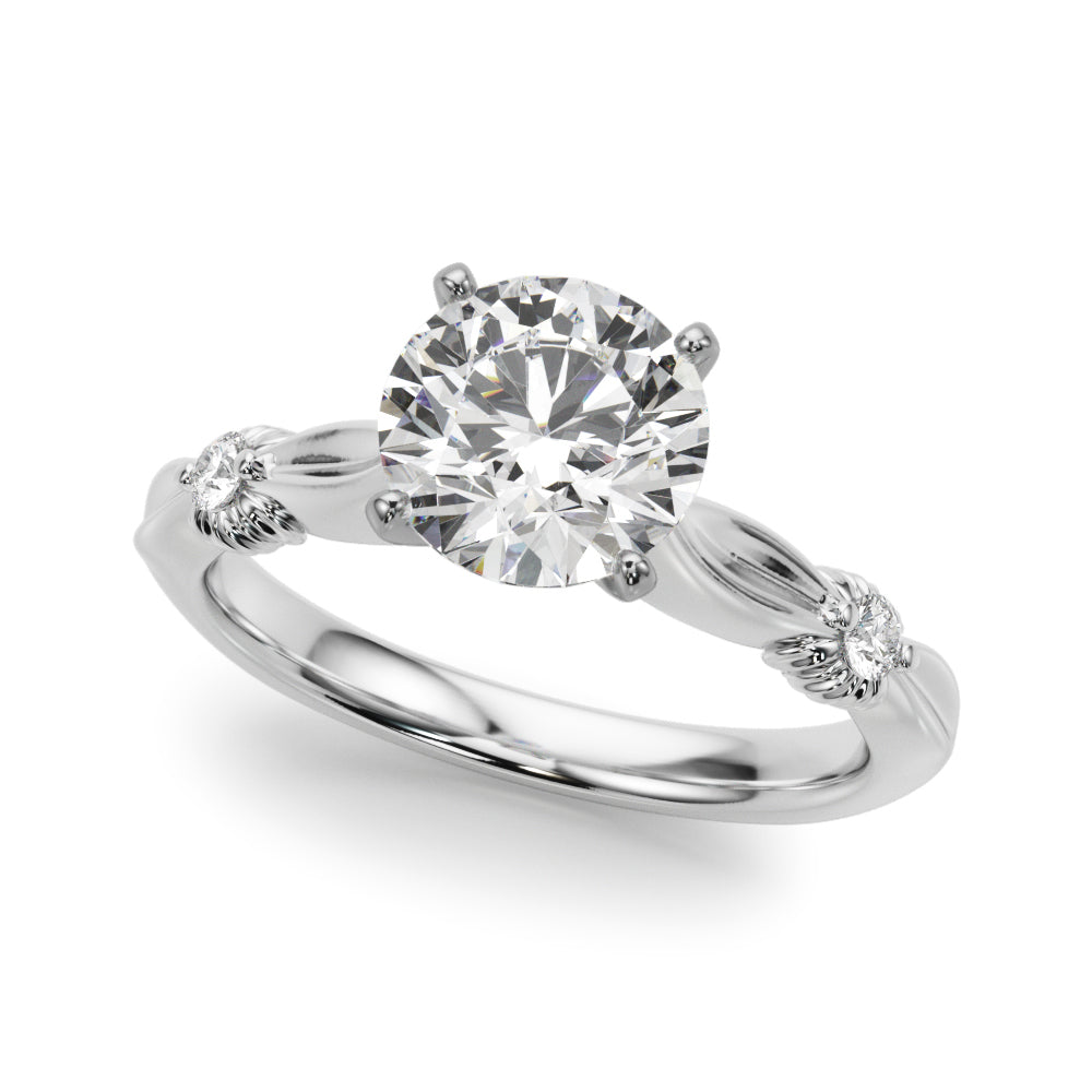 This ring is a solitaire ring style with a 1.00ct. round brilliant cut diamond mounted in your choice of 14kt. white, yellow or rose gold. The ring has fancy shoulders mounted with 2 additional small round brilliant cut diamonds, approximately 0.05ctw. This ring is available with your choice of Natural Diamonds or Lab Grown Diamonds.