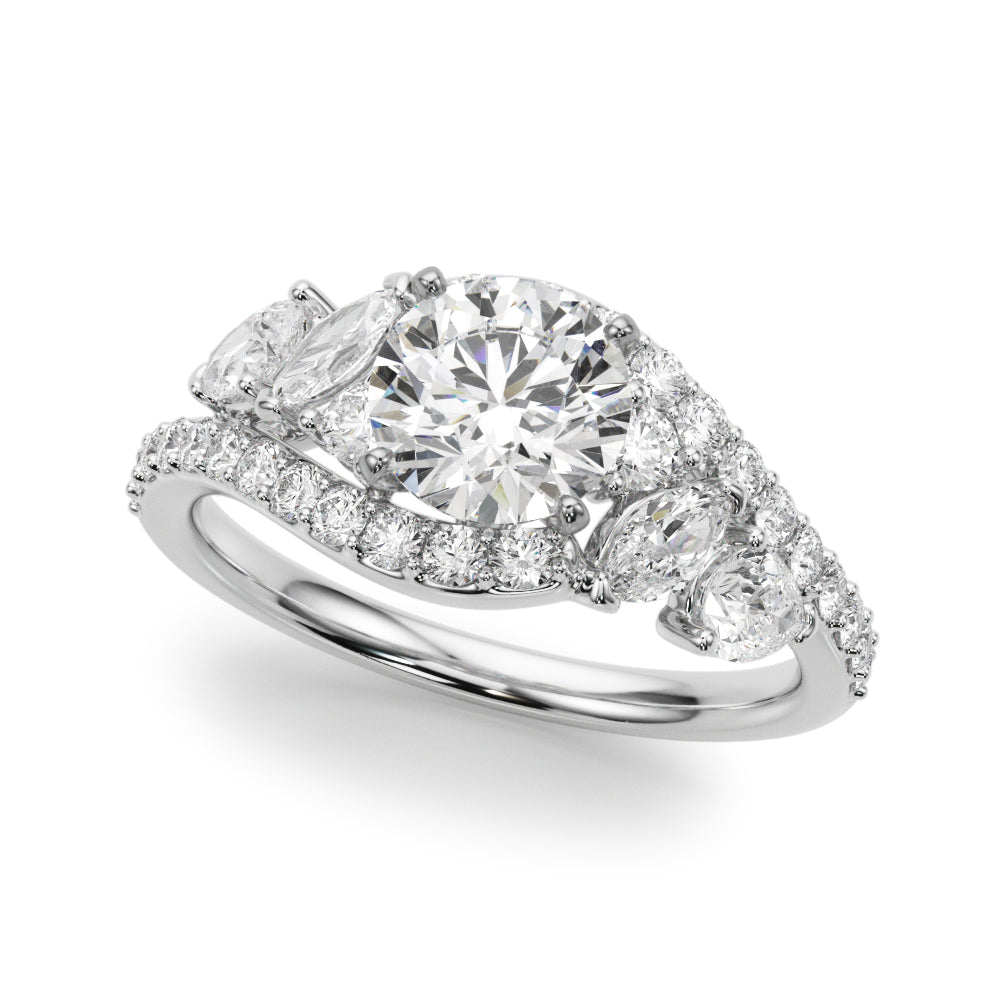 This ring features a round brilliant cut diamond mounted in your choice of 14 white, yellow or rose gold. The center diamond is within the approximate size range of 1.00ct. with additional Marquise, Pear and Brilliant Cut diamonds mounted on the shoulders of the ring with an additonal approximate weight of 1.00ctw. This ring is available with your choice of Natural Diamonds or Lab Grown Diamonds.