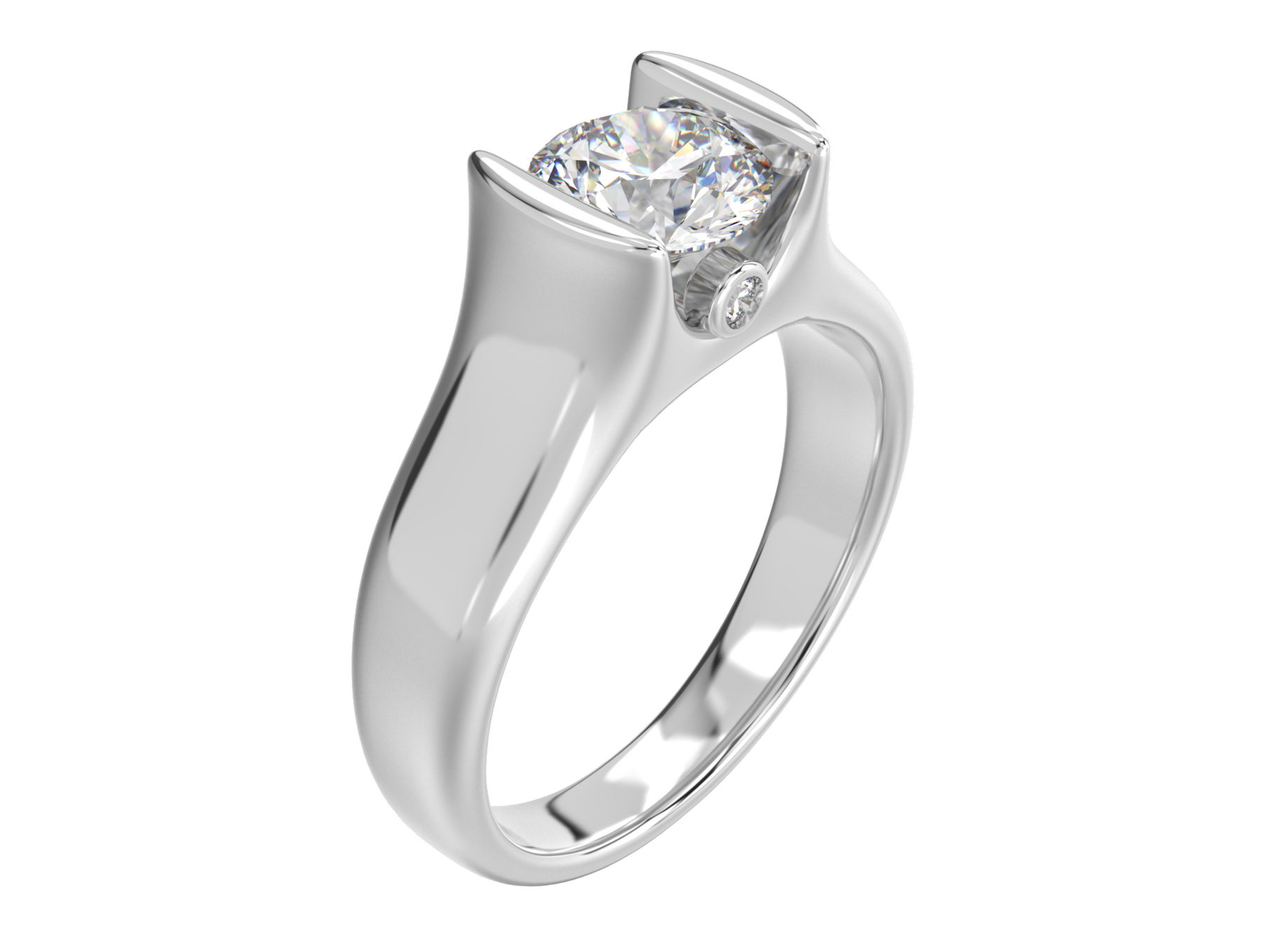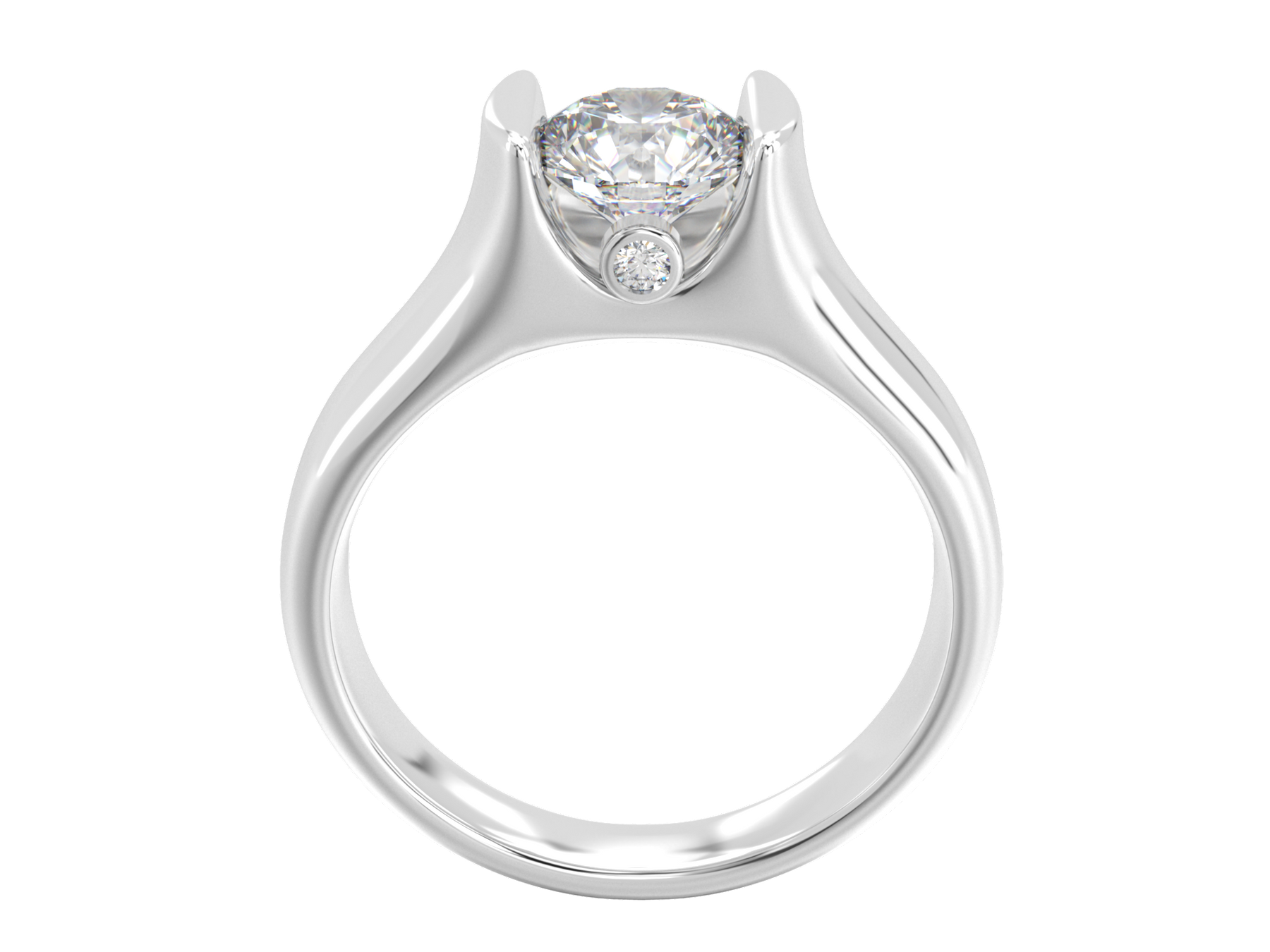 Custom-designed and handcrafted, this elegant 14kt gold diamond ring is accented with two round-cut, bezel-set diamonds on either side of the design, totaling approximately 0.12 carats. The centerpiece features a stunning round brilliant-cut diamond, approximately 1.00 carat in size, set in a sleek tension-style setting. This ring is available for customization in your choice of white, yellow or rosegold, as shown, and can be set with either natural or lab-grown diamonds.
