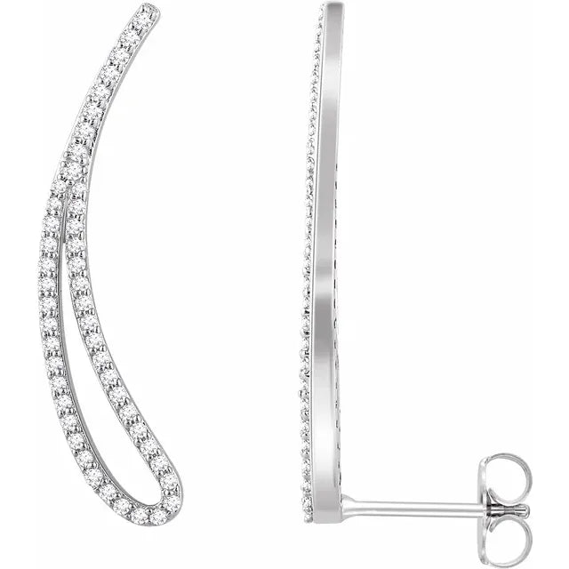 Each earring features two parallel rows of brilliant diamonds meticulously pave-set along a graceful curve, designed to elegantly climb up the earlobe. The diamonds create a continuous line of sparkle, offering a unique and eye-catching adornment. They are secured with a comfortable post backing, allowing the design to gently hug the ear for confident wear. Natural diamonds will be within the range of SI clarity and G-H-I color or higher, while lab grown diamonds will be within the range of VS clarity and F-G color or higher. For lab grown diamond pricing, please contact us directly. These versatile earrings add a touch of effortless sophistication to any look, perfect for a modern statement or a chic everyday accent.