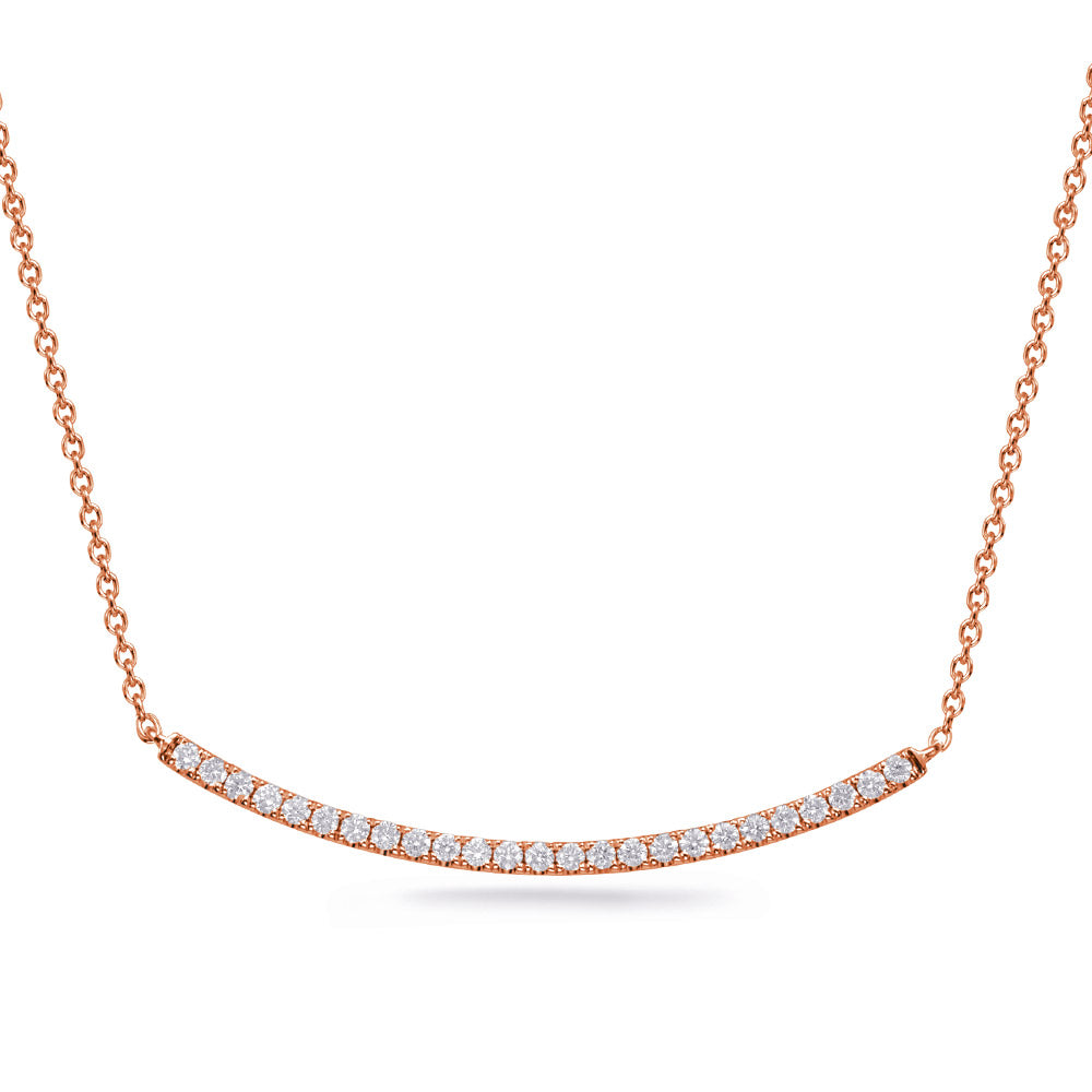 This necklace is available in your choice of 14kt. white, yellow or rose gold. There are a total of 25 natural round brilliant cut diamonds, approximately 0.25ctw. of SI1 clarity and G color, set in a micro pave setting. The bar measures approximately 36mm., with the necklace length approximately 16-18 inches.