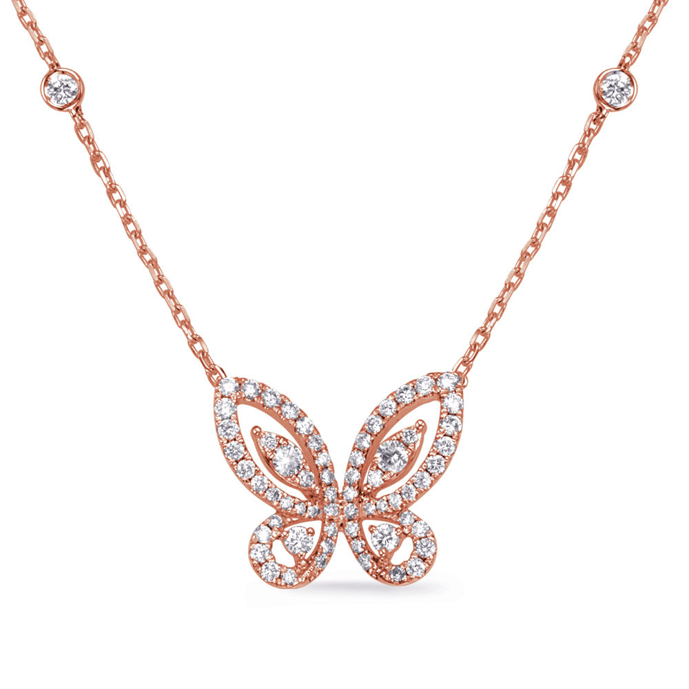 This 14kt. gold butterfly necklace is available in White, Yellow or Rose gold. It features a total of 66 round natural diamonds with a very good cut with an approximate total carat weight of 0.65ct. of SI1 clarity and G color. This necklace measures approximately18 inches in length.