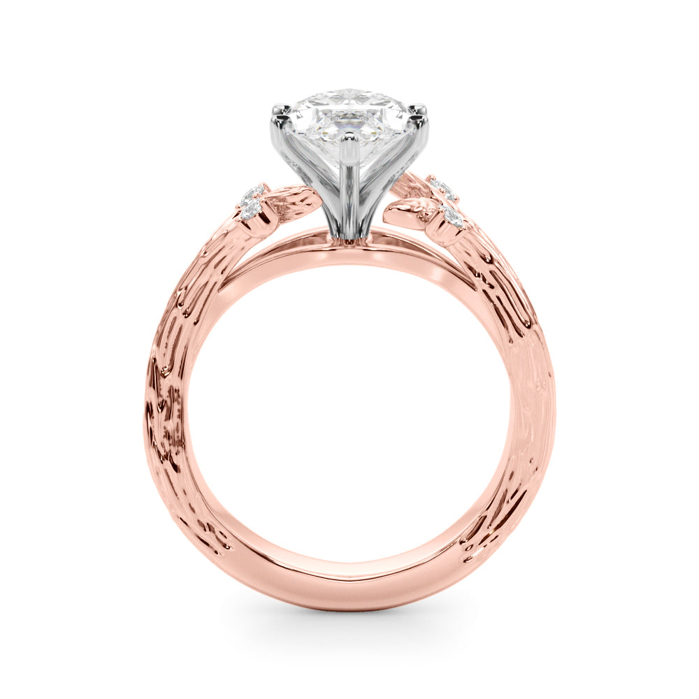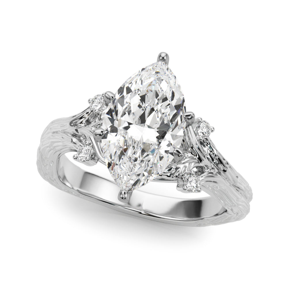 This distinct engagement ring is crafted in your choice of 14k white, yellow, or rose gold, featuring a striking nature-inspired aesthetic. It showcases an elegant 1.00ct Marquise Cut Diamond, known for its elongated shape and pointed ends, which creates a flattering look on the finger. The bold band is carved with a deep, realistic bark texture, giving the piece a rustic yet luxurious feel. Nestled subtly within the textured metal are a few round accent diamonds, which provide a quiet sparkle and total approximately 0.06ctw, emphasizing the organic artistry of the design.